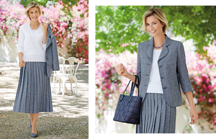 Looking for a subtler ensemble? Our cotton tweed jacket in a flattering shade of dove grey is the perfect piece to wear. Wear with the pima cotton jersey top or a knitted pointelle top for warmth and the textured bias skirt in a co-ordinating hue. For a splash of colour add bright accessories for a striking contrast.