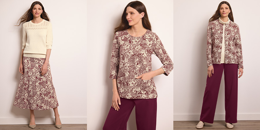 Our burgundy jacquard pieces beautifully embody the essence of the season, featuring intricate, intertwining leaves and botanical motifs. These exquisite designs offer a cohesive and stylish look, whether you choose a feminine skirt, a versatile tunic, or a cosy cardigan to complete your ensemble. With their rich burgundy hue and luxurious jacquard fabric, these pieces are sure to elevate your autumn wardrobe.