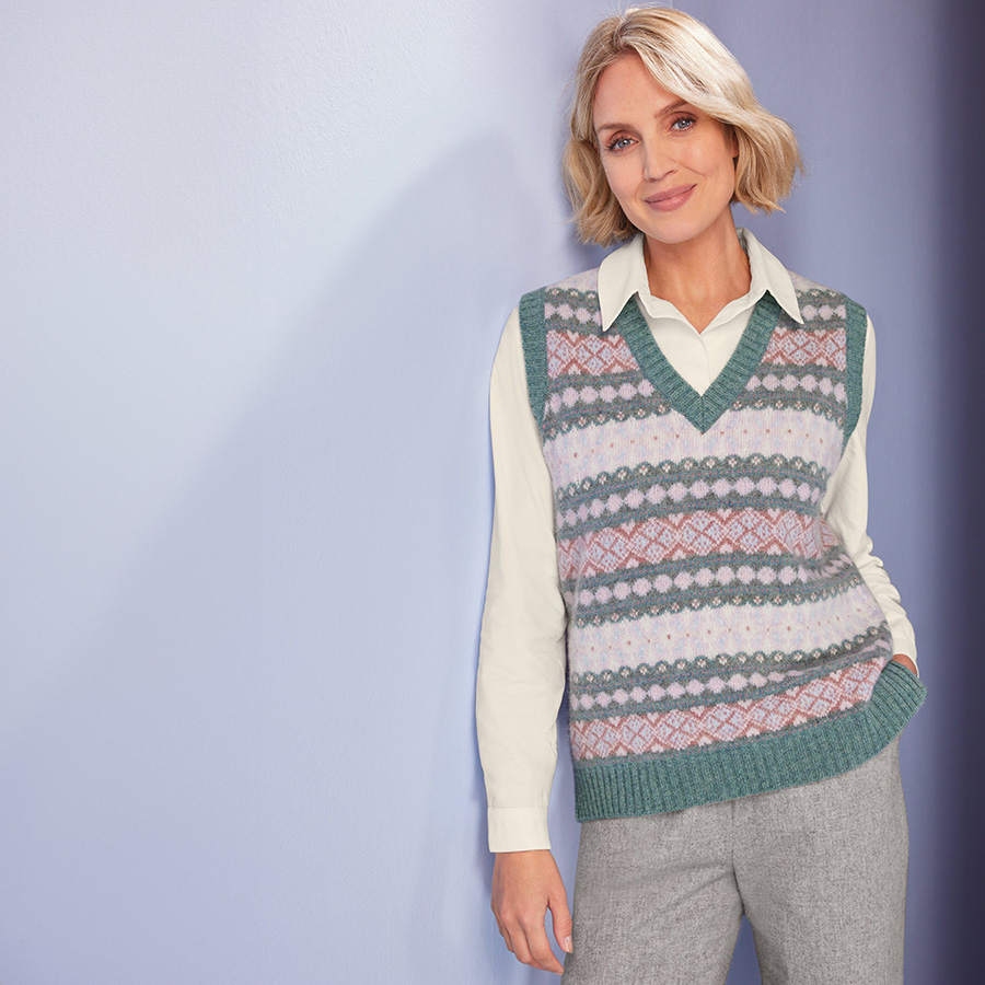 Whilst we continue to submerge ourselves within the chill of January, this lovely layering piece is knitted to create the finest lovat and pink toned Fair Isle pattern. This classic piece has been formed using 100% pure merino wool, giving you buildable warmth from winter through to spring.