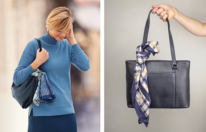 Whether you’re adding a pop of colour to a handbag, or being prepared for a weather change during the day, simply tie your scarf around the handle of your handbag. Depending on the size and length, you may want to roll it a little thinner or fold it into a square shape to achieve the optimum look.