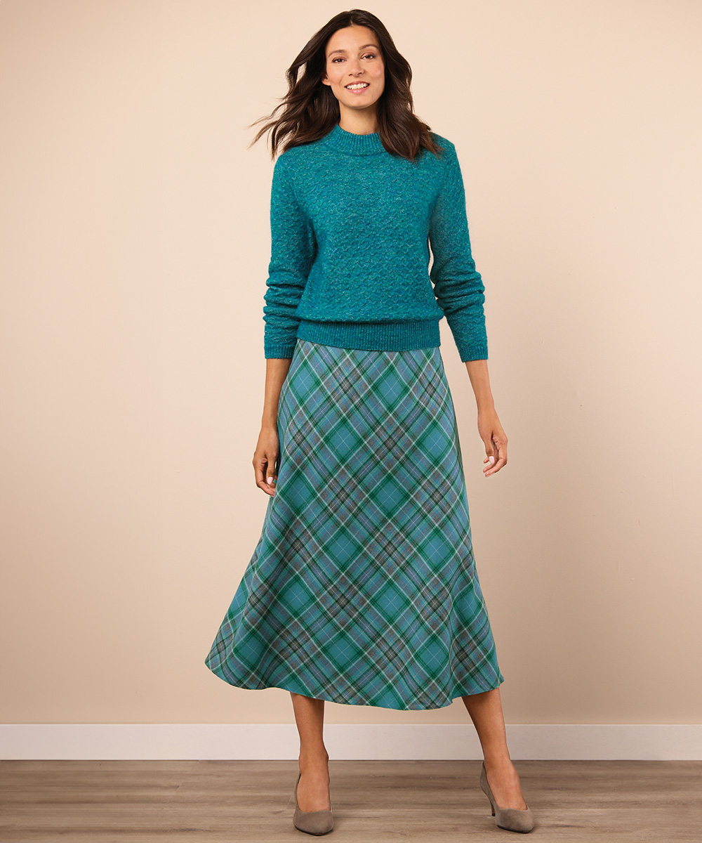 In addition to the pleated skirts, our Heritage Collection features a bias skirt style. This flattering piece skims the body, creating the illusion of a smoother silhouette, and features a stylish teal check that will elevate your wardrobe. Complete the perfect autumn and winter look by styling this piece with our teal Textured Turtleneck.