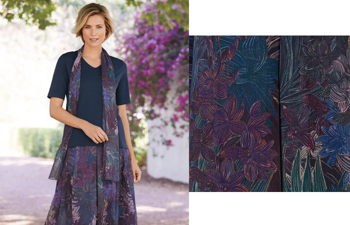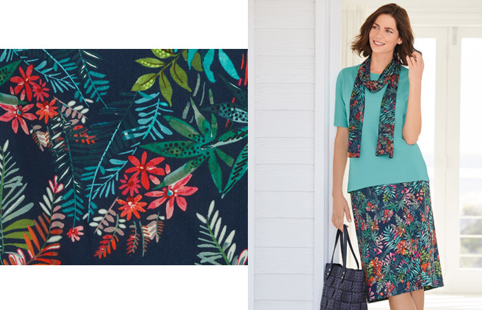 This gorgeous print of garden flowers makes a beautiful skirt and matching scarf. Pair with a plain navy top, like this V-neck T-shirt so that your ensemble isn't overly busy. The subtle colour palette can be worn on a number of different occasions.