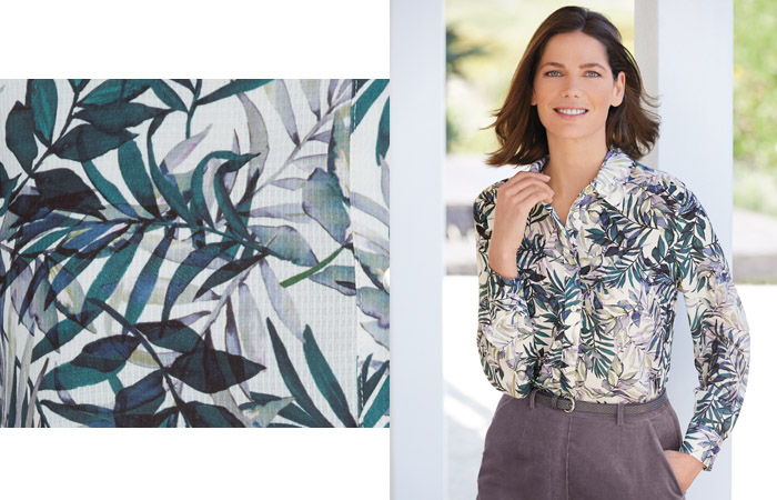 Flattering and stylish, this blouse has a print of tropical leaves that have the graduated colouring of a pretty watercolour painting. Ideal to add interest to your outfits or you can wear with our cord trousers that highlight the purple hues on the blouse.