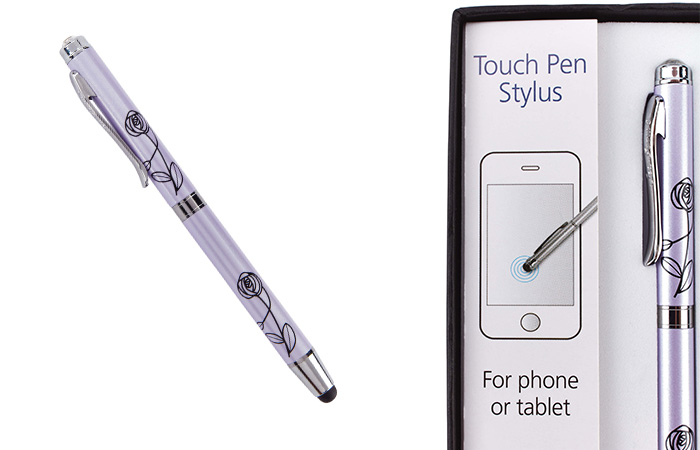 Inspired by Charles Rennie Mackintosh, our elegant black ink ballpoint pen with a soft end to use as a stylus, is ideal for use with mobile phones, I-pads and screens.