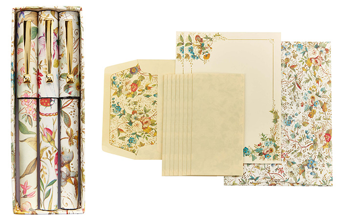 With a traditional gold leaf embellished floral print, this stunning Florentine paper stationery set is made exclusively for us in Florence. The charming floral print is featured on the writing paper, the inside of the envelopes and the pocket in which it is stored. Pair the lovely Florentine paper stationery set with our delightful set of black ink pens, printed with three different floral designs and packaged in a floral presentation box.