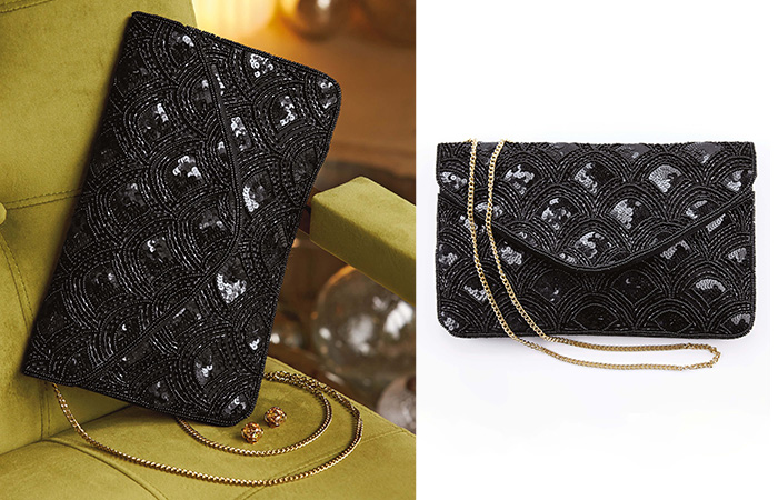 With an elegant art deco design, this delightful bag with all-over beading and has a gold chain to wear over the shoulder or can be carried as a clutch bag with the chain tucked away. Perfect for bringing a little glamour to any outfit.