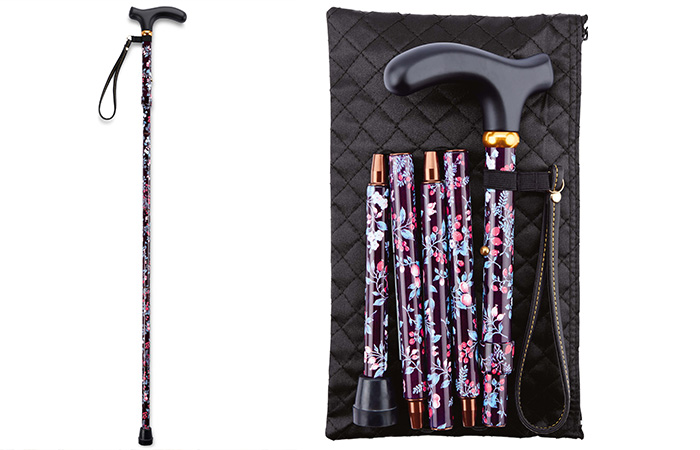 Printed with a striking floral design, this clever height-adjustable aluminium cane conveniently folds into five sections and fits into a smart quilted bag when not in use.