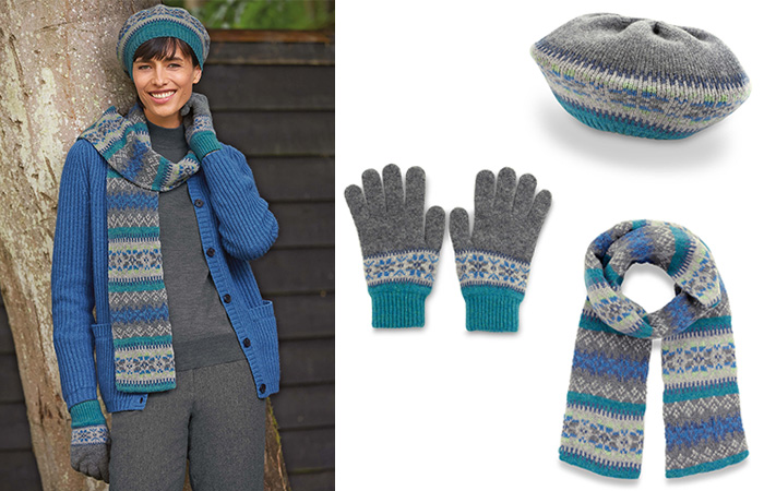 These soft pure new wool accessories are spun in Scotland. They include a beret, scarf and gloves in the heritage design of Islay Fairisle, featuring a lovely blend of tonal greys and blues reminiscent of the landscape. These charming matching accessories are the perfect gift to keep your friends and loved ones warm this season.