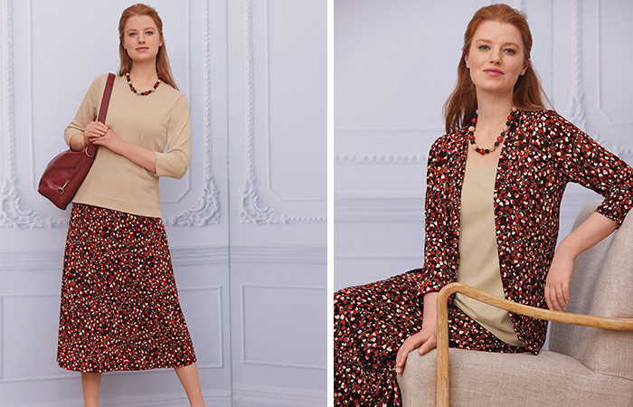 For a matching printed head-to-toe look, opt for our beautiful crêpe mock front jersey top and skirt in gorgeous black and rust hues. Alternatively, you can mix plains such as our pima crewneck top with our crêpe jersey skirt.