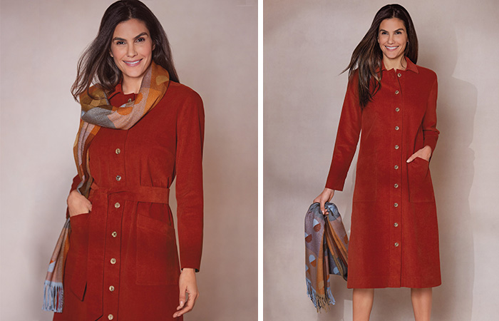 In wonderfully soft needlecord, this versatile dress can also be worn as a long line overshirt. An unlined style, with bust dart shaping, patch pockets, top-stitch detail and a matching belt. Add our rust-coloured Italian woven jacquard scarf to complete the outfit.